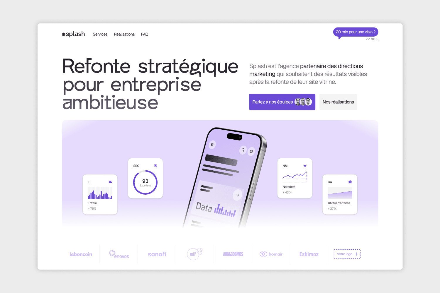 Splash est l'agence partenaire des directions marketing. Avec un positionnement fort et une identité visuelle marquée, l'agence porte son message.